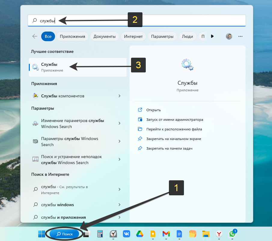 Как зайти в службы через поиск в Windows 10 / 11 / 7