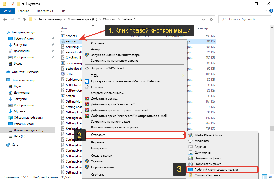 Если вы часто переходите в службы Windows, то прямо с той папки можете сделать ярлык для быстрого запуска прямо с рабочего стола. Для этого кликните по файлу правой кнопкой мыши, выберите «Отправить» — «Рабочий стол (создать ярлык)».