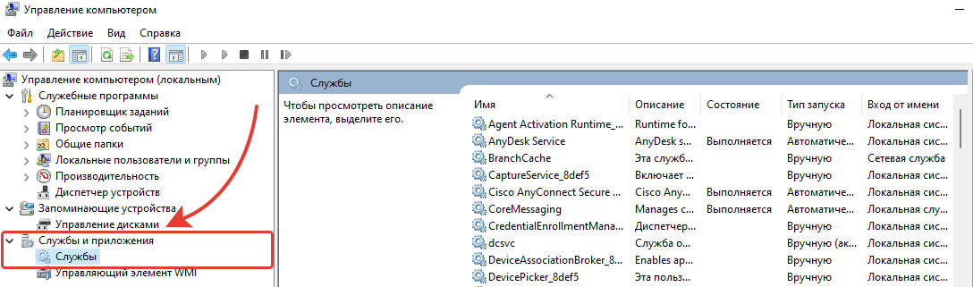Переход к службам в Windows 10 / 11 через раздел «Управление компьютером»