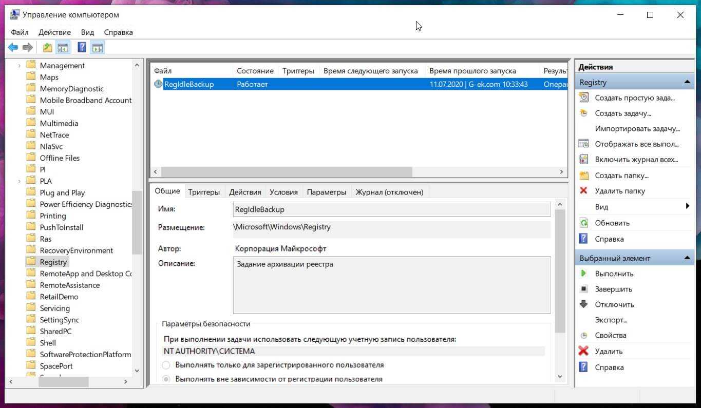 Важно отметить, что задача RegIdleBackup автоматически запускается только один раз в 10 дней. Дополнительные триггеры, которые вы установили для задачи, игнорируются. Если вам необходимо выполнять резервное копирование реестра ежедневно или при необходимости, вы можете открыть планировщик задач, чтобы запускать задачу вручную по требованию. Либо запустите следующую командную строку от имени администратора: