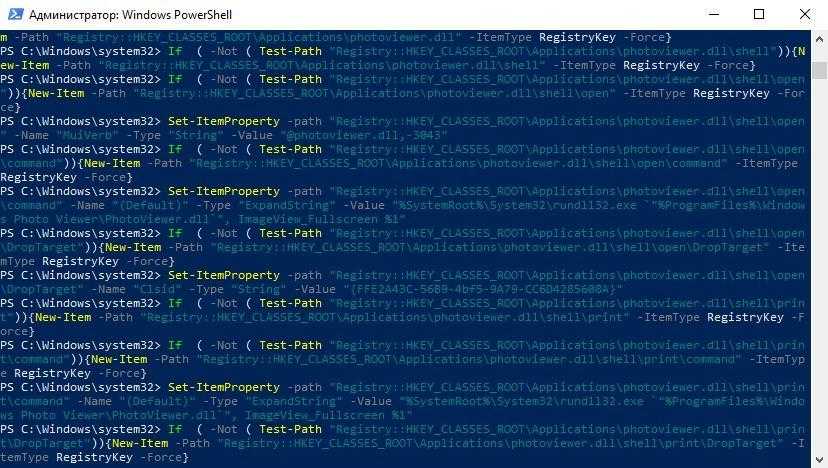 Set-ItemProperty -path «Registry::HKEY_CLASSES_ROOT\Applications\photoviewer.dll\shell\open\command» -Name «(Default)» -Type «ExpandString» -Value «%SystemRoot%\System32\rundll32.exe `»%ProgramFiles%\Windows Photo Viewer\PhotoViewer.dll`», ImageView_Fullscreen %1″