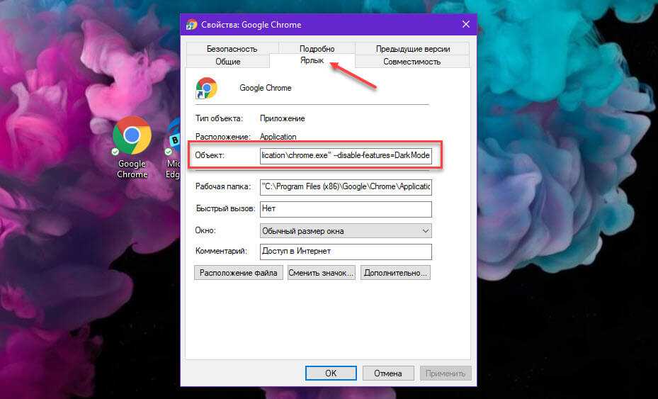Щелкните правой кнопкой мыши по ярлыку Google Chrome и зайдите в «Свойства». На вкладке «Ярлык» добавьте к «Объекту» через пробел этот строковой параметр «—disable-features=DarkMode» и примените изменения.