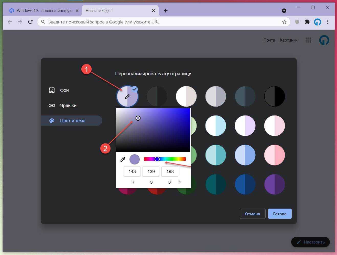 Если хотите, вы можете самостоятельно подобрать нужный цвет \ оттенок для Chrome — нажав «Выбрать цвет» (первый значок с изображением пипетки). Просто кликните на понравившейся цветовой гамме и нажмите Enter