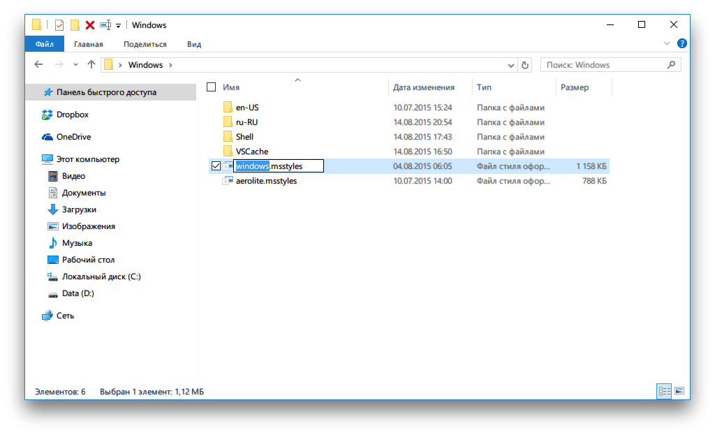 Откройте эту папку в файловом менеджере. Переименуйте находящийся в этой папке файл aero.mstyles