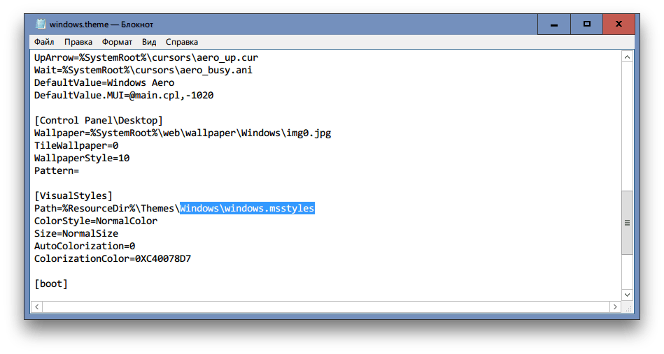 Откройте теперь этот файл в «Блокноте». Найдите в секции Visual Styles строку