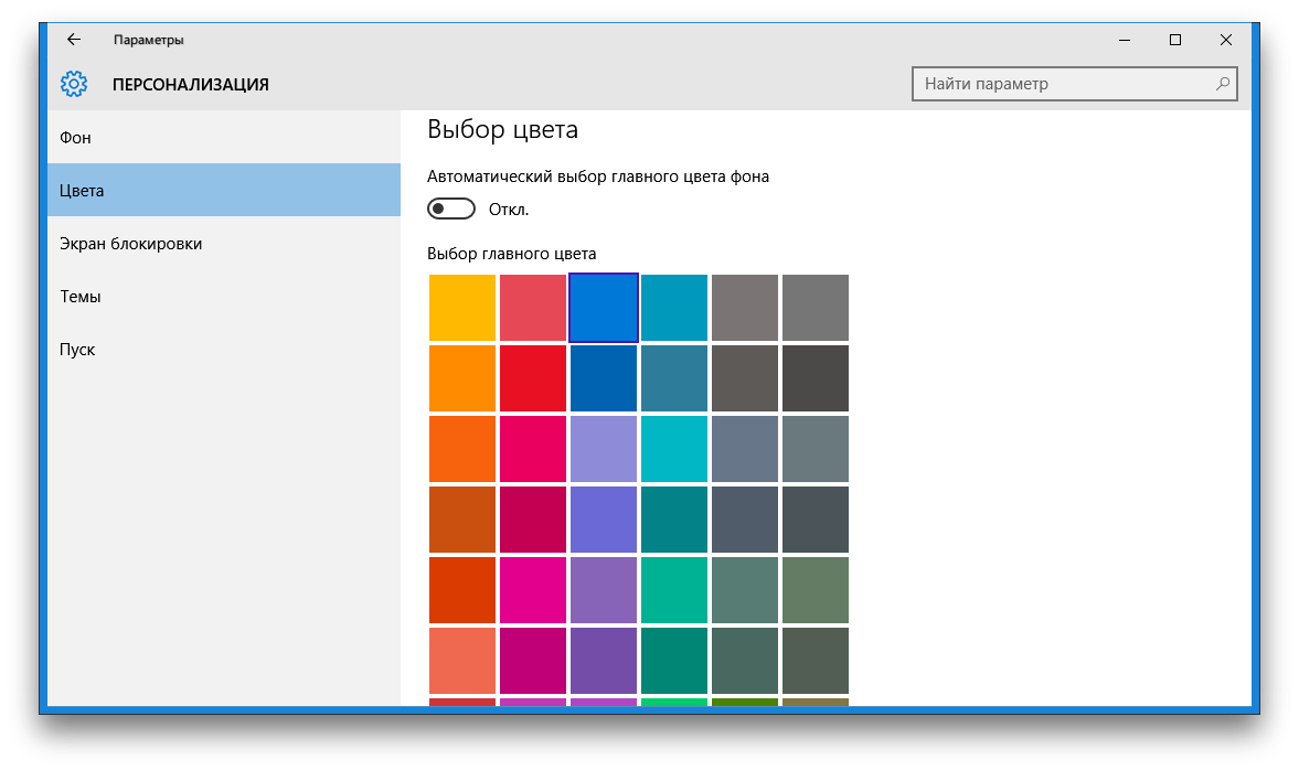 Для изменения цвета окон можно открыть соответствующую настройку («Пуск» → «Параметры» → «Персонализация» → «Цвета» → «Выбор главного цвета»). Или включить автоматический выбор, при этом цвет окон будет примерно соответствовать цвету обоев рабочего стола.