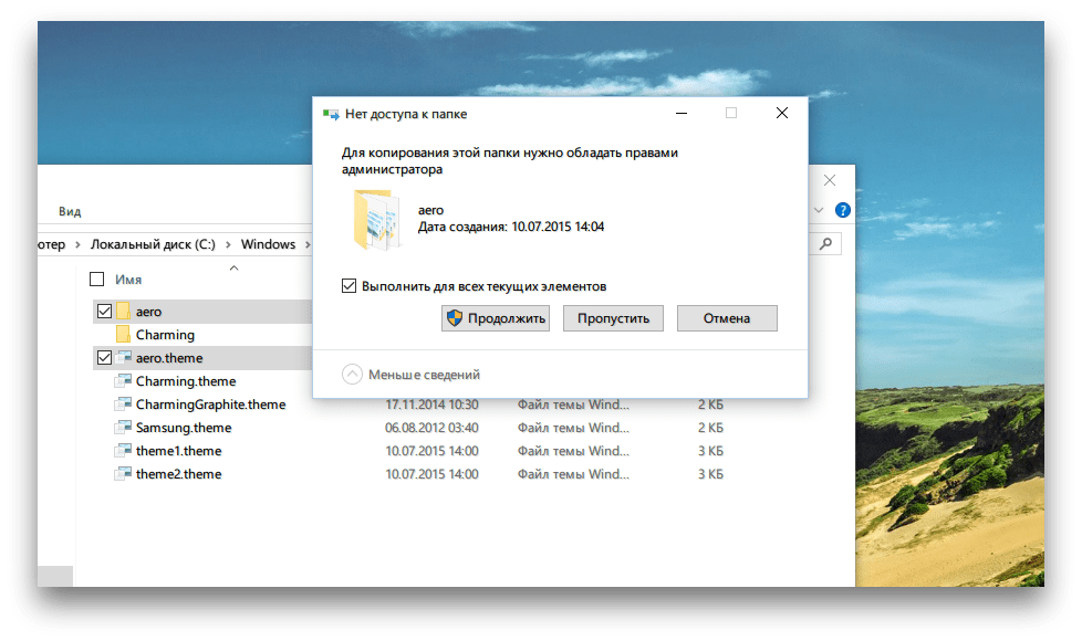 В процессе копирования вы увидите ещё одно сообщение об отсутствии доступа к файлу. Поставьте флажок возле «Выполнить для всех текущих элементов» и нажмите кнопку «Пропустить».