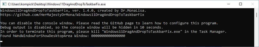 Эта весящая всего 100 килобайт утилита служит единственной цели — восстановлению функции перетаскивания файлов на расположенные на панели задач значки запущенных приложений. Утилита лишена графического интерфейса, при запуске тулзы откроется командная строка, которая через короткое время сама же закроется.