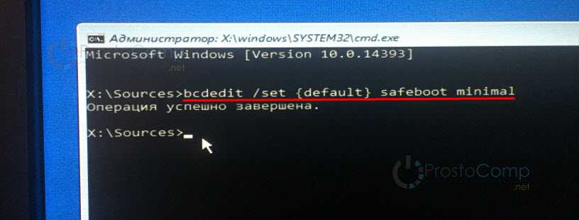 - После открытия командной строки вводите – bcdedit /set safeboot minimal.