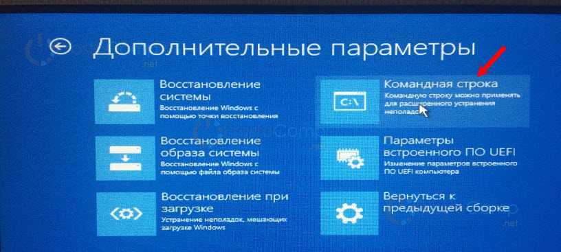 - После этого должно появиться самое первое, с чего начинали (рис. выше). Выбирайте Поиск и устранение неисправностей → Дополнительные параметры → Командная строка.