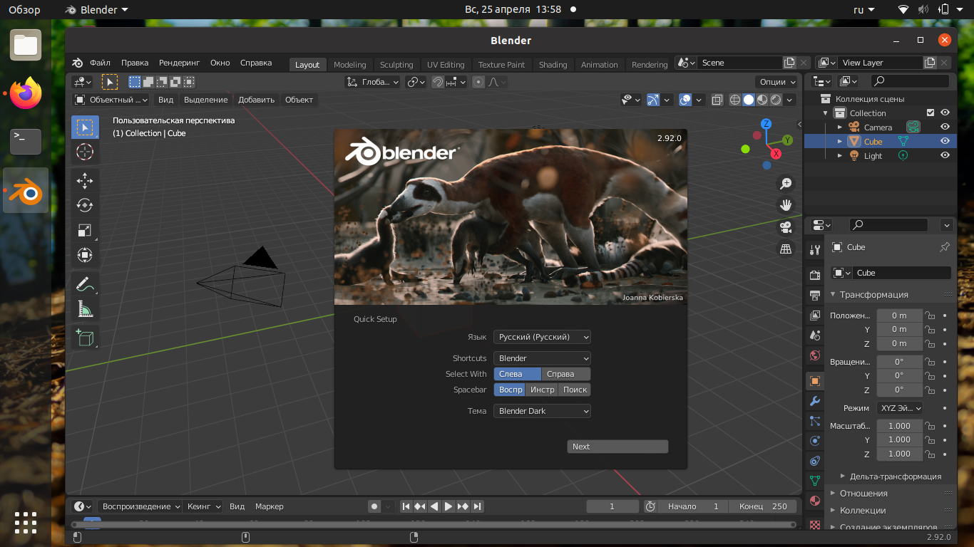 Профессиональный редактор эффектов для Linux. Но возможности Blender простираются гораздо дальше. Приложение предназначено для работы с 3D-анимацией, что может пригодиться при создании трёхмерных персонажей для фильмов и видеоигр. Чтобы установить Blender, введите следующую команду в терминале: