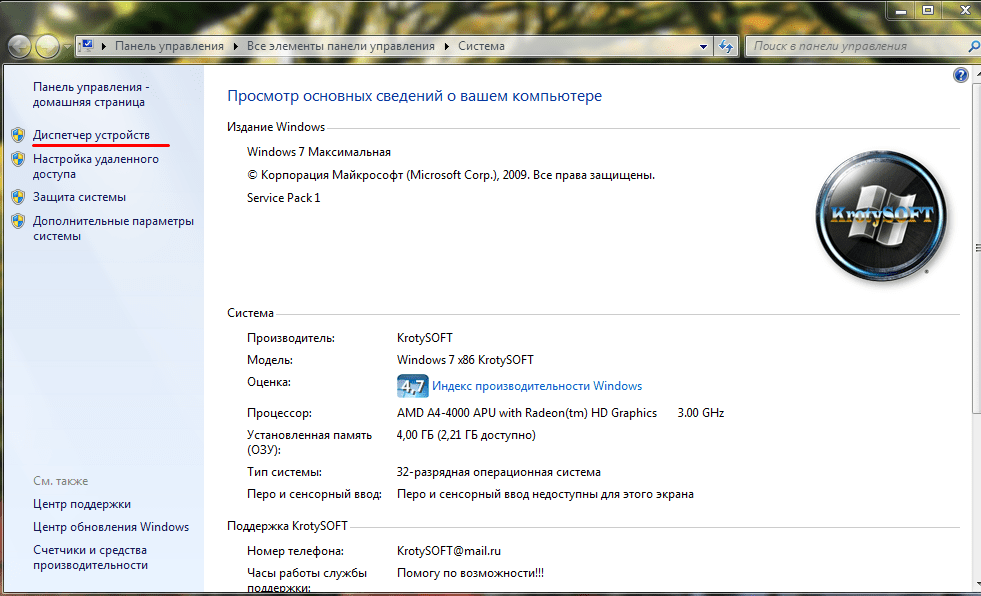 Открыть вкладку с оборудованием, отыскать Диспетчер устройств.