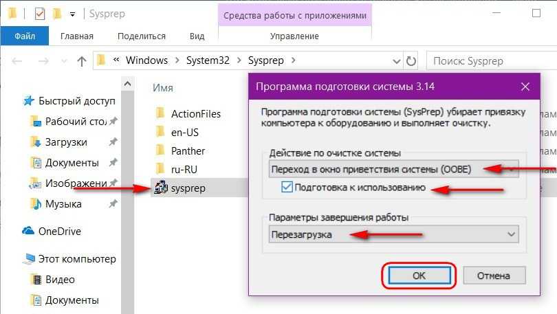 Второй способ – использование штатного средства подготовки системы к развёртыванию на корпоративных устройствах Sysprep. Вводим это название в поле команды «Выполнить», в открывшемся проводнике запускаем средство, выставляем в нём настройки, как показано на скриншоте, и жмём «Ок».