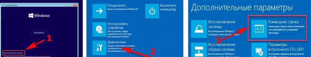 - Следующий шаг, выбираем «Диагностику», «Дополнительно», «Командная строка».