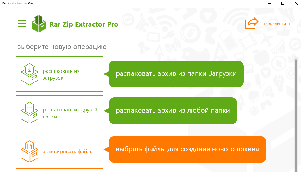 Программа Rar Zip Extractor Pro больше подходит для компьютеров со сенсорным экранами, поскольку имеет большие кнопки интерфейса для управления программой. Есть поддержка всех популярных форматов, и возможность создавать и извлекать архивы таких форматов, как 7z, ZIP, RAR, CAB, TAR, ISO и других. Из минусов программы стоит сказать об наличии навязчивой рекламы, что компенсирует то что она совершенно бесплатна.