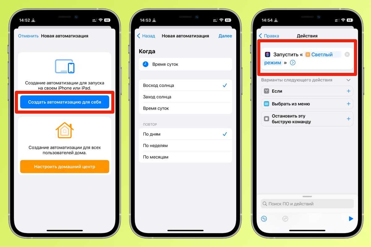 Создайте еще одну автоматизацию для темного режима. Только вместо Восхода солнца выберите Заход солнца и команду для темной темы.