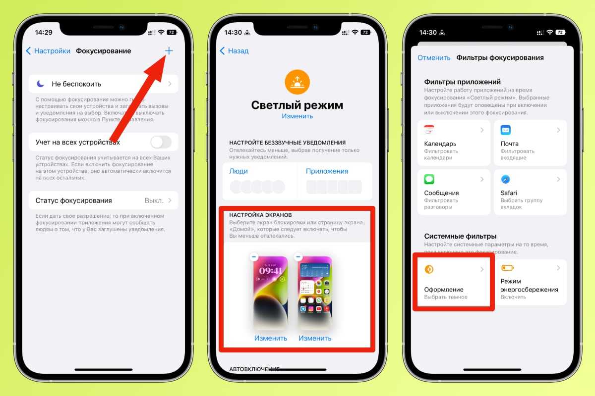 1. Откройте Настройки → Фокусирование2. Нажмите на + в правом верхнем углу и выберите Собственное3. Придумайте название (например, светлая тема) для режима и нажмите Далее, а затем Настроить фокусирование4. Выберите нужный экран блокировки и домашний экран5. В разделе Фильтры фокусирования нажмите Добавить фильтр, выберите Оформление и светлую тему