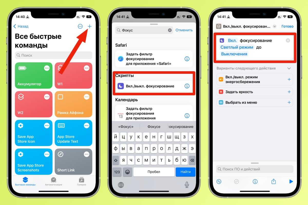 1. Откройте приложение Команды и нажмите + в правом верхнем углу для создания новой команды2. Придумайте название, а в списке действий выберите Вкл./выкл. фокусирование3. Скрипт должен выглядеть следующим образом: Вкл. фокусирование Светлая тема до Выключения4. Нажмите кнопку Готово