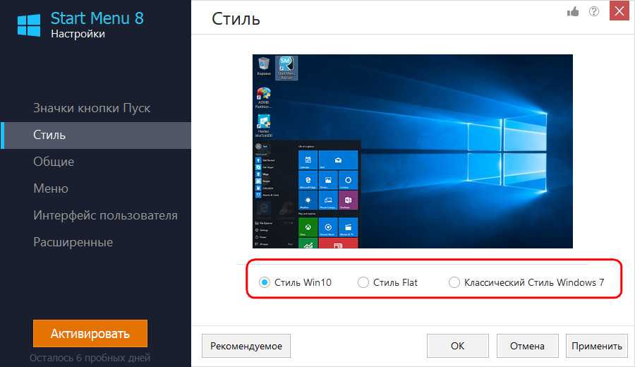 В настройках можно применить для стилей классического и Flat эффект прозрачности, выбрать отдельный от системного цвет, а также сменить вид кнопки «Пуск».