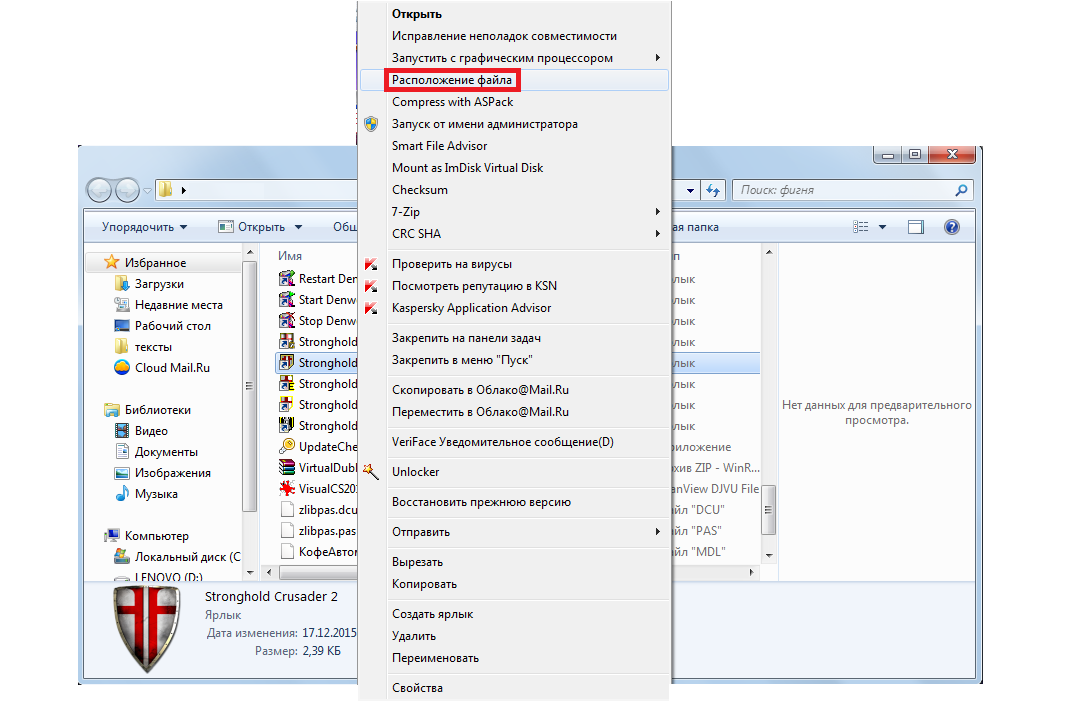 В папку с программой или игрой, которая не запускается из-за возникновения рассматриваемой нами ошибки. Если вы запускаете это приложения при помощи ярлыка на рабочем столе или где-либо еще, нажмите на него правой кнопкой мыши. В выпадающем меню выберете «Расположение файла». Так вы попадете в корневой каталог этой самой программы. Вот туда и нужно скопировать загруженную библиотеку mdll.