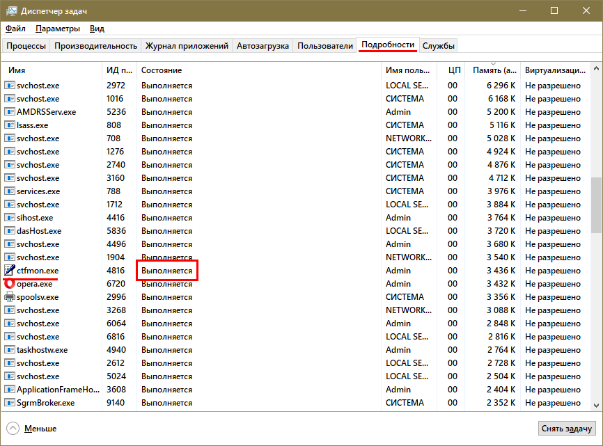 За работу устройства отвечает процесс «ctfmon.exe». По идее он должен автоматически запускаться, однако иногда этого не происходит
