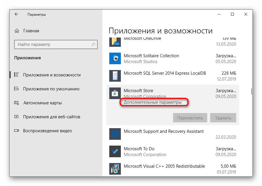 Выберите приложение левой кнопкой мыши и щелкните по кликабельной надписи «Дополнительные параметры».