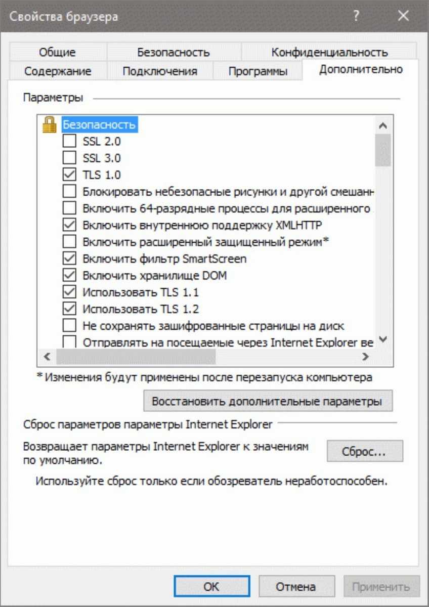 Откройте Свойства браузера. Перейдите на вкладку «Дополнительно» — убедитесь что флажка рядом с Использовать TLS 1.2. Выберите «Применить / OK».