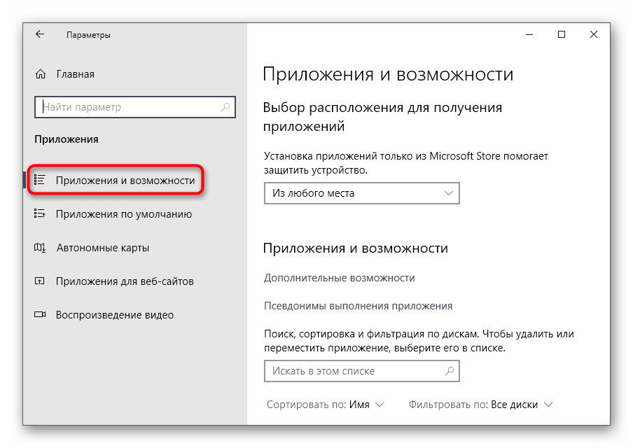 - Откройте приложение «Параметры» и перейдите в раздел «Приложения и возможности».