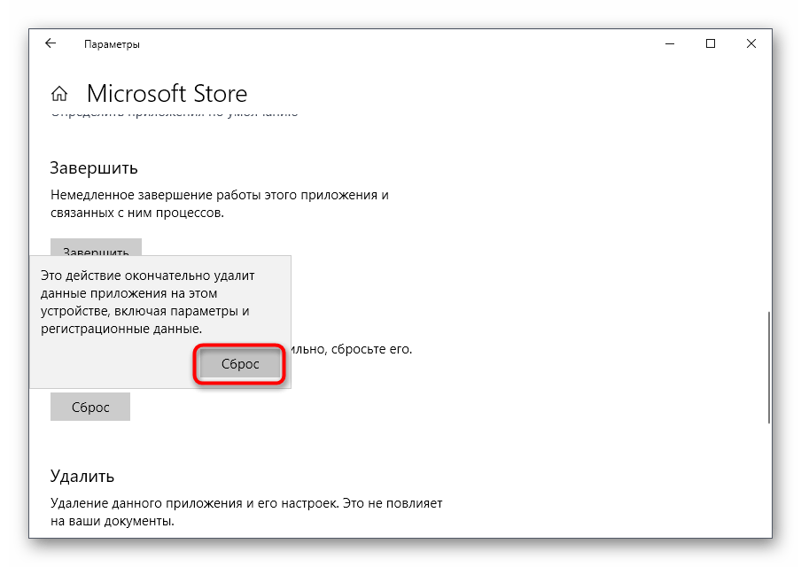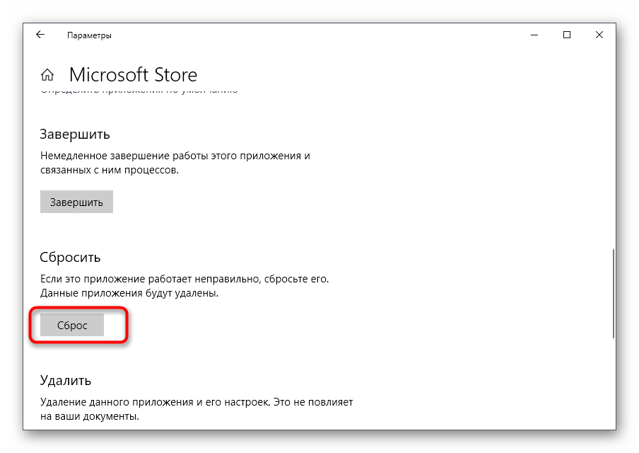 Иногда фирменный Магазин Виндовс работает неправильно, в чем поможет разобраться только полный сброс через встроенную функциональность операционной системы. Этот метод не всегда оказывается эффективным, но прост в реализации, поэтому и стоит на третьем месте.