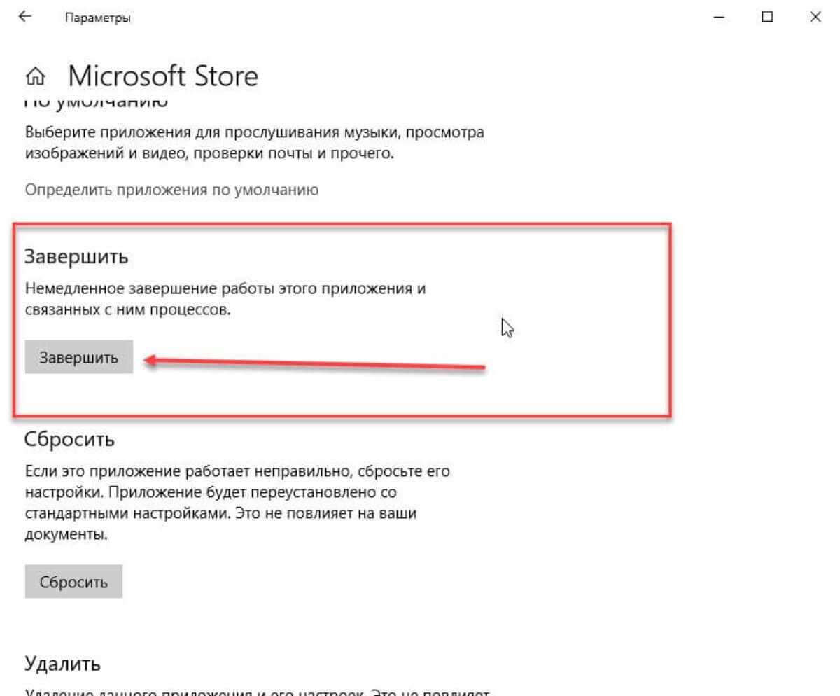 - В открывшимся окне найдите «Немедленное завершение этого приложения и связанных с ним процессов» (см. картинку) и нажмите кнопку «Завершить».