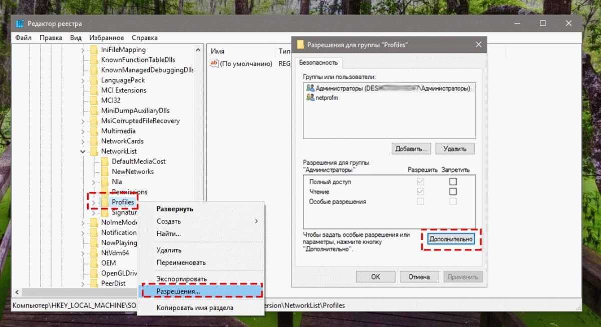 Нажмите правой кнопкой мыши по ключу Профили и перейдите в раздел Разрешения . Нажмите Дополнительно .
