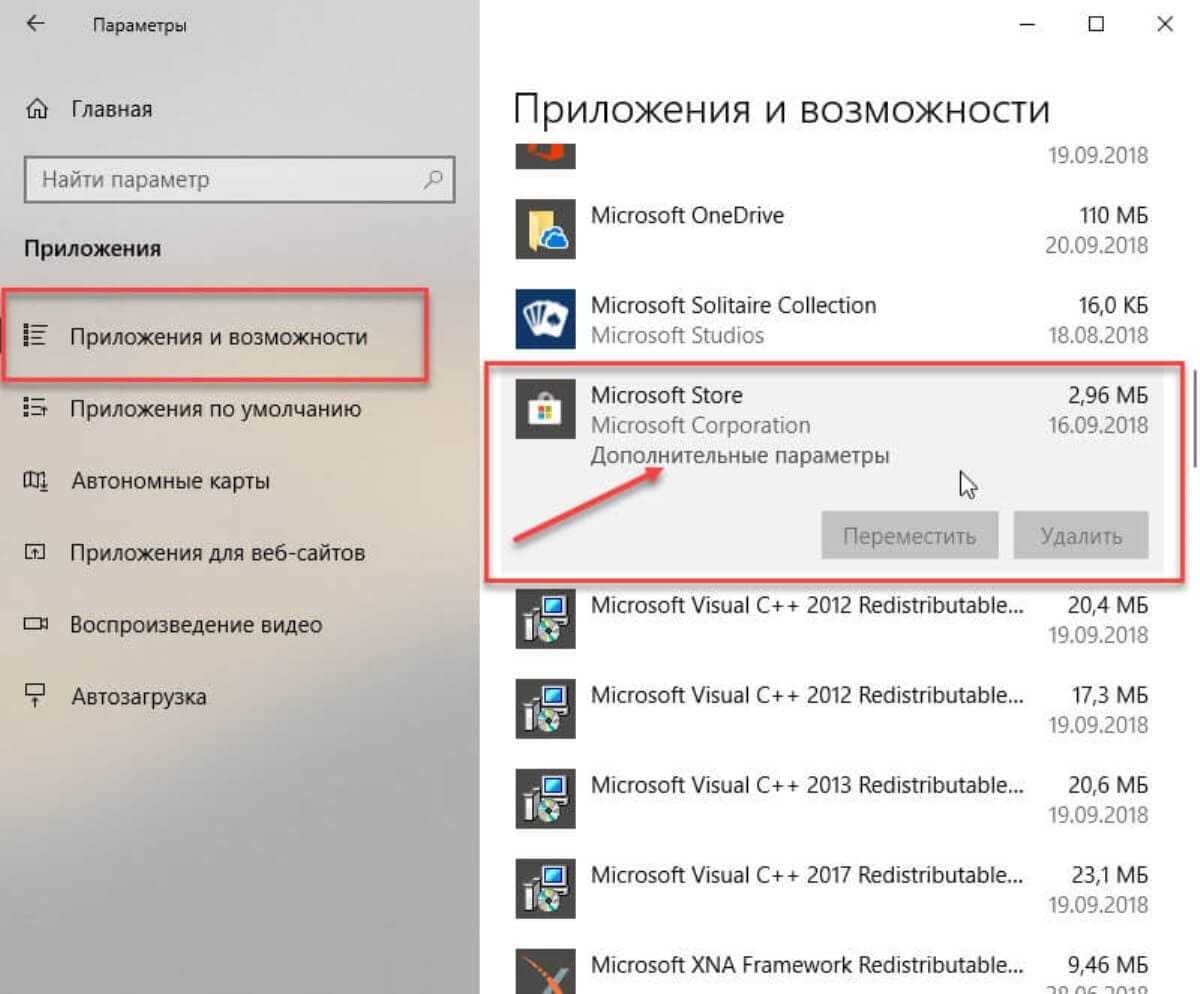 Через категорию «Приложения и возможности» опускайтесь вниз списка, чтобы отыскать там Microsoft Store.