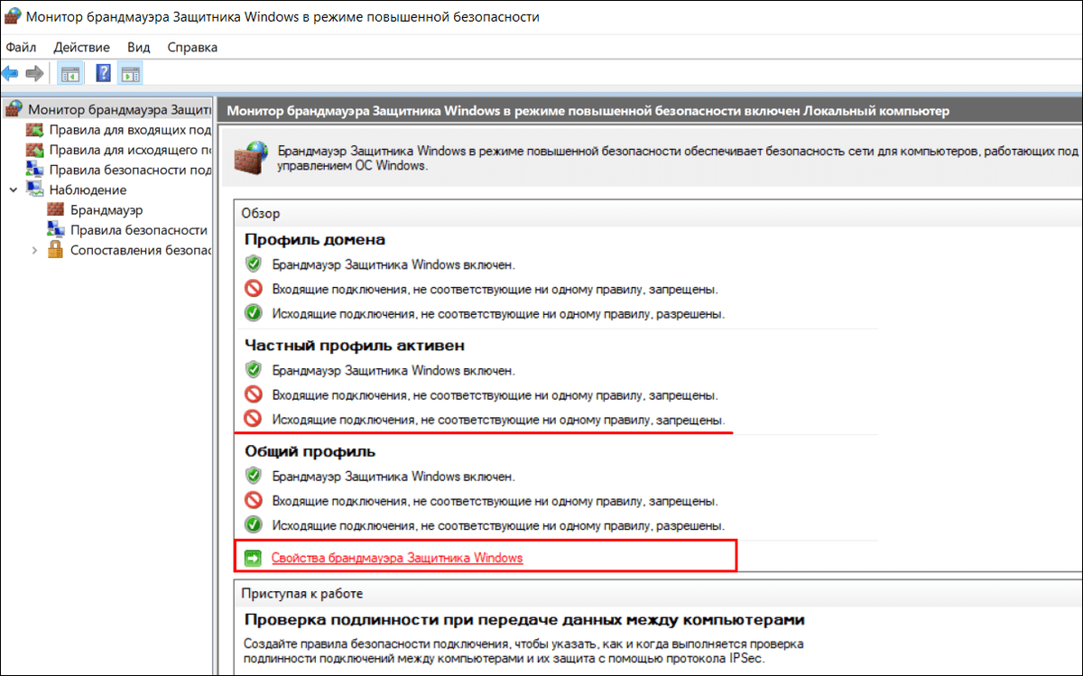 - В окне монитора межсетевого экрана, которое откроется после этого, кликните «Свойства брандмауэра защитника Windows».