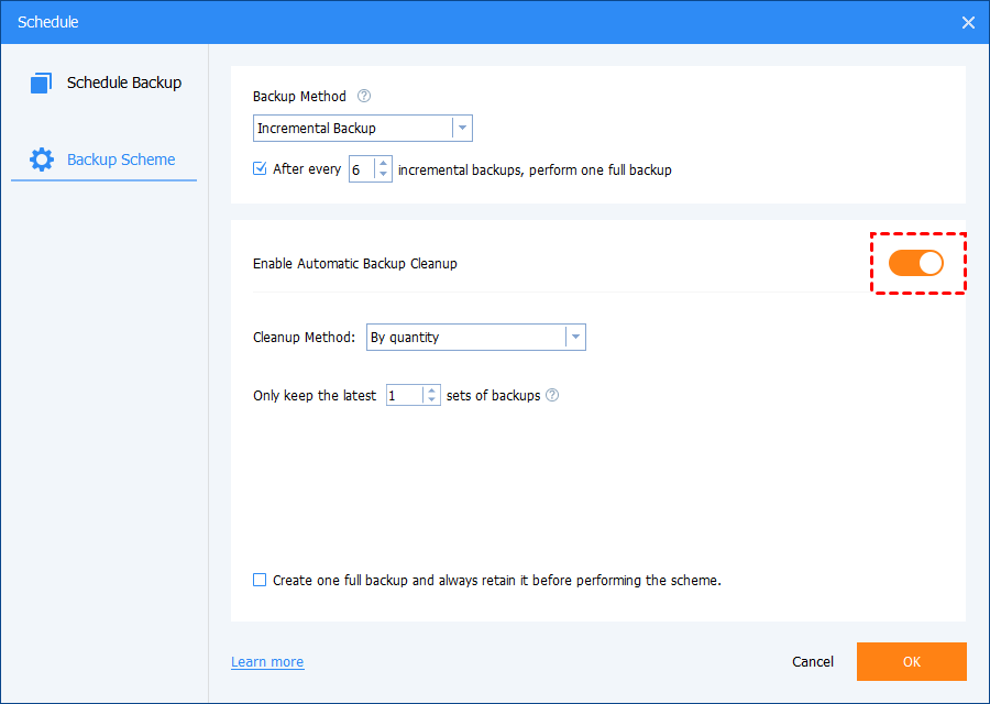 - Click Backup Scheme to save only changed files with incremental or differential backup or delete old backups with automatic backup cleanup.