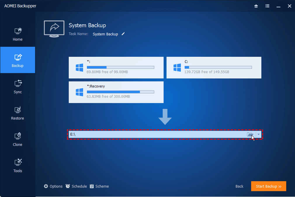 Launch this software, switch to Backup tab and select System Backup. Then, it will automatically include all the related system partitions to simplify the backup process. So you only need to select a target path to store the image backup. Afterward, click Start Backup to execute the task.
