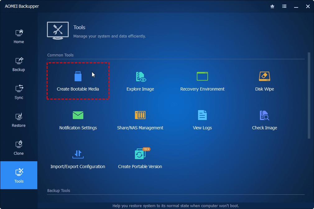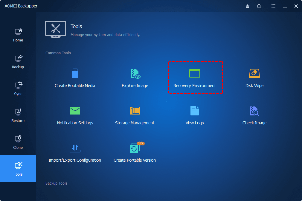 - Launch the software, navigate to Tools tab and select Recovery Environment under Common Tools.