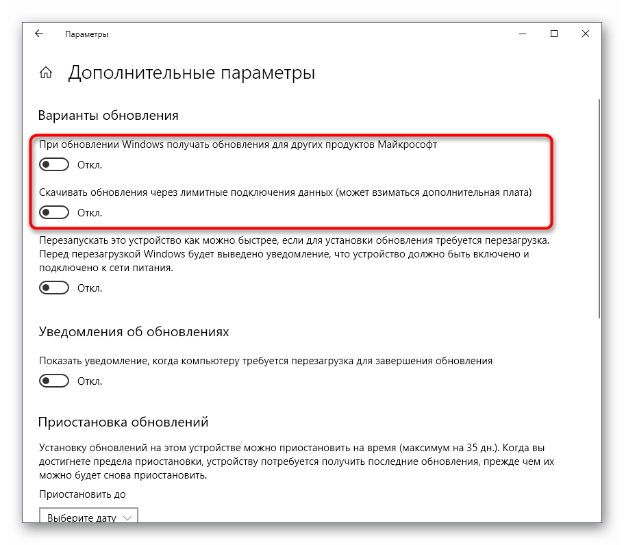 Сперва хотим затронуть тему дополнительных параметров обновлений. В них присутствует два важных пункта, отвечающих за поиск обновлений для приложений Microsoft и загрузку при лимитных подключениях. Эти два параметра необходимо отредактировать следующим образом:
