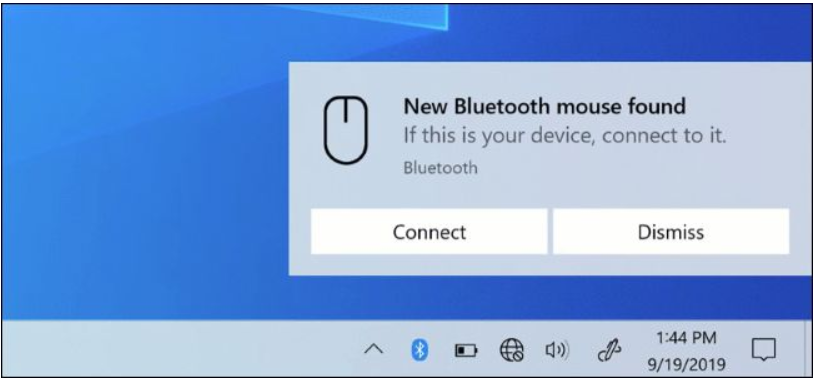 Если в зоне досягаемости присутствует поддерживаемое устройство, переключенное в режим сопряжения, отобразится предложение включить синхронизацию. Опция стала доступна в апрельском обновлении Windows 10 2018 года. Сейчас же технология более упорядочена. Весь процесс синхронизации выполняется посредством панели уведомлений и не требует перехода в «Настройки». Еще теперь показывается меньше маловажных уведомлений. Появилась и кнопка «Отключить», позволяющая закрыть уведомления при отсутствии желания связывать устройства. В оповещении дополнительно отображается имя и тип устройства.