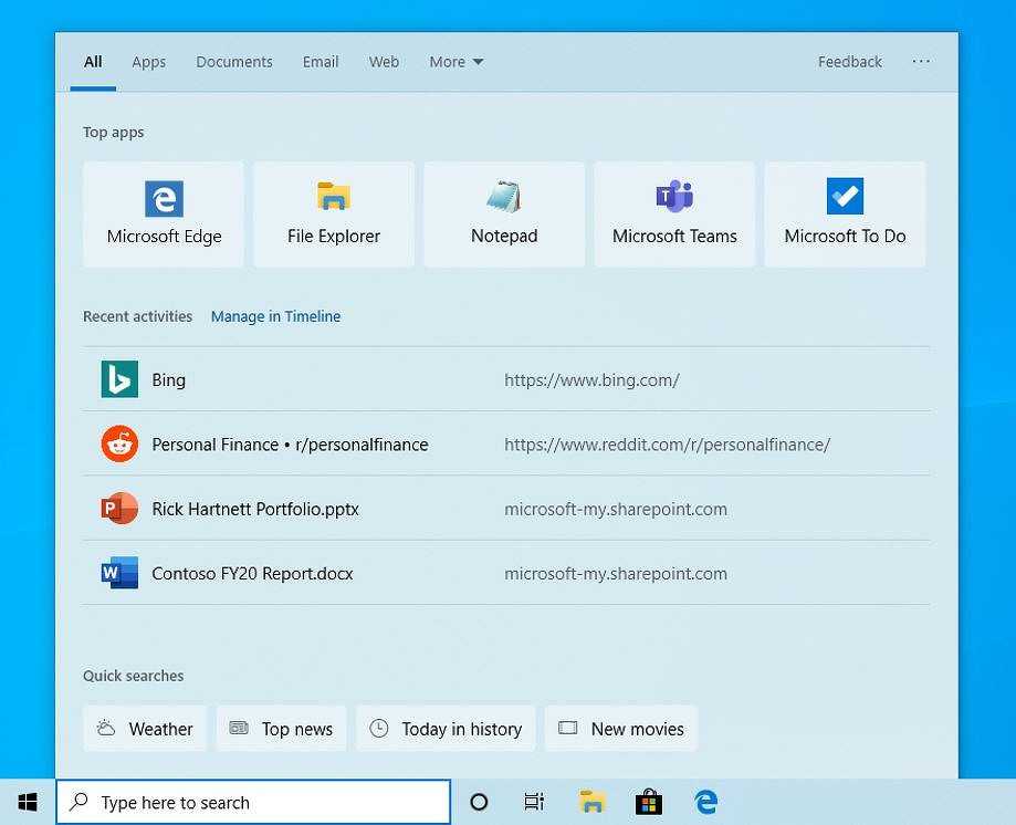 Для поиска в приложениях и настройках Microsoft улучшила проверку орфографии – повышена вероятность нахождения искомого, даже если запрос был введен с опечатками. Дополнительно была модифицирована система поиска в «Проводнике»: теперь выводит результаты поиска не только в памяти компьютера, но и одновременно в облаке OneDrive.