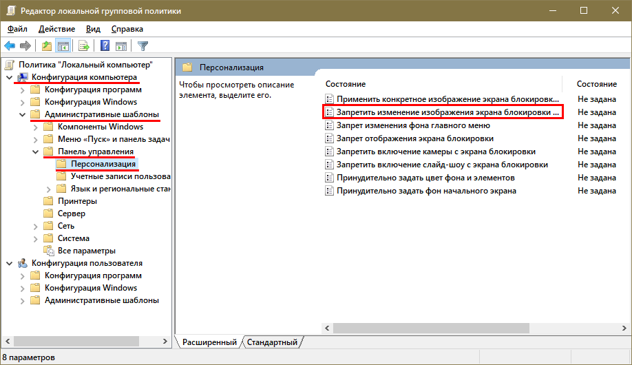 - Откроется окно редактора локальной групповой политики. Переходим по ветке «Конфигурация компьютера», «Административные шаблоны», «Панель управления», «Персонализация». Находим параметр «Запретить изменение изображения экрана блокировки». Задаем ему значением «Отключено». Для других параметров в этом разделе должно быть выставлено значение «Не задано».