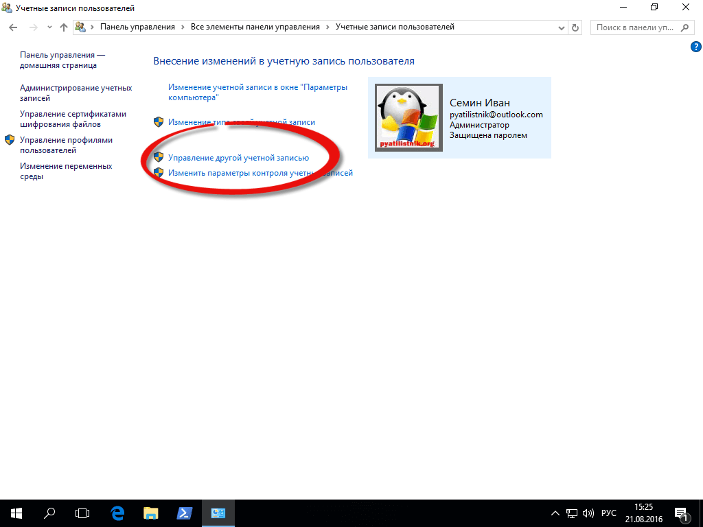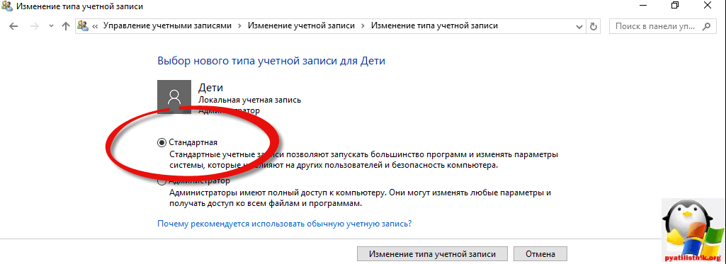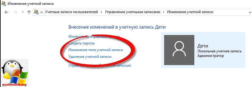 У меня есть учетная запись Дети, и у нее полные права администратора. Если же у вас нет другой учетной записи, то в этом же пункте вы можете его создать.