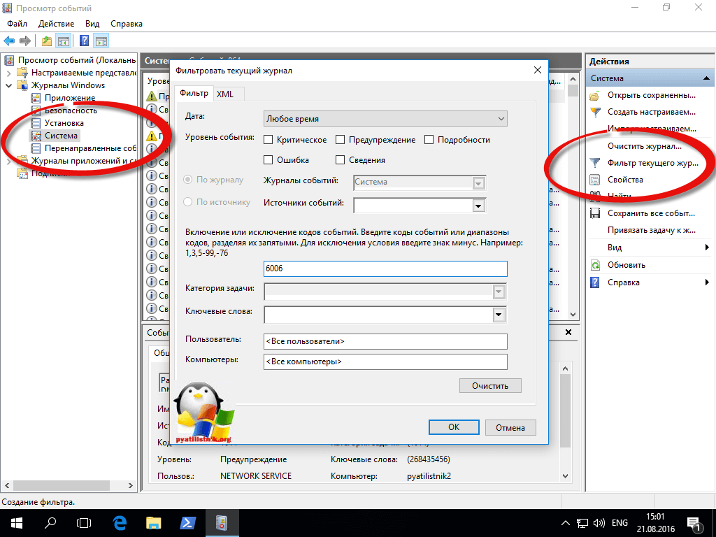 Переходим в журнал Система, нажимаем Фильтр текущего журнала, в открывшемся окне вводим код 6005 и жмем ок.