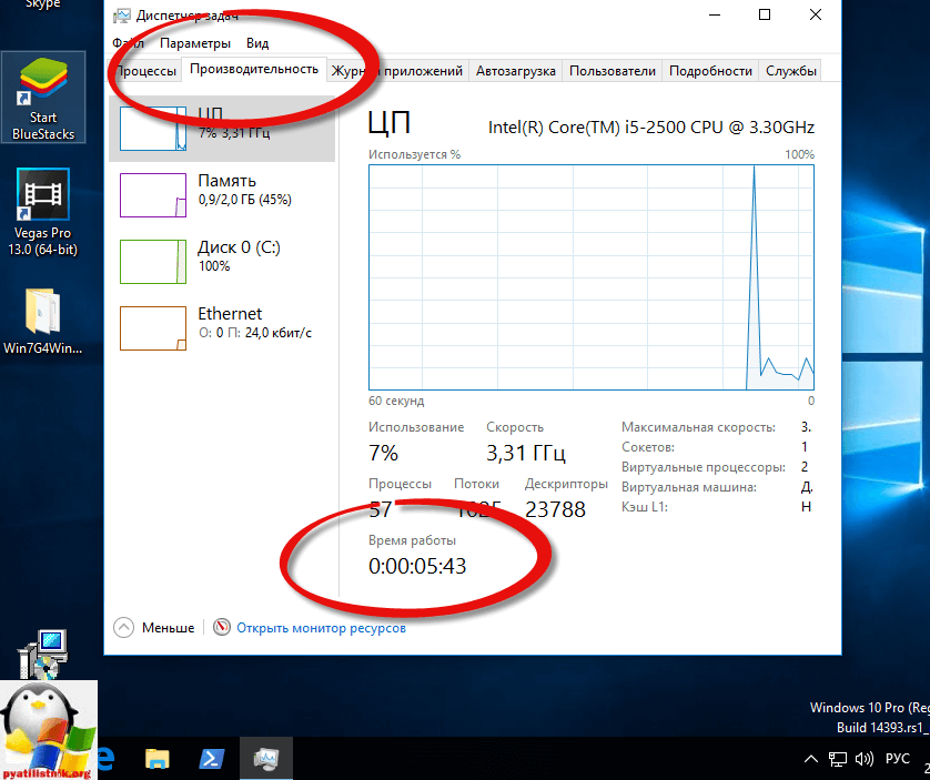 Переходим на вкладку Производительность и в самом низу вы обнаружите пункт Время работы Windows 10 Redstone. В моем примере я только, что загрузился и у меня оно равно 5 минутам и 53 секундам.