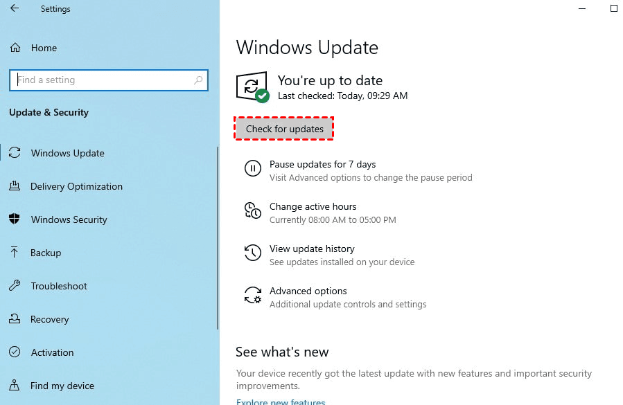 - On the Windows Update page, click Check for updates. If updates are available, install them.