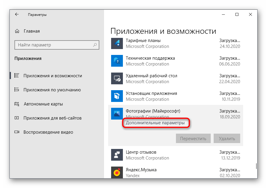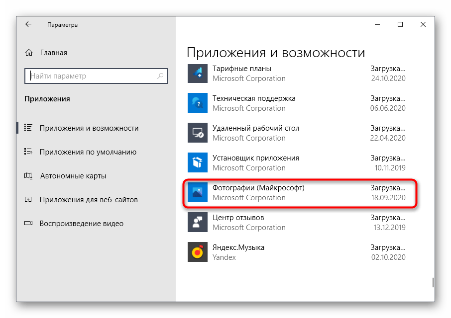 Опуститесь в конец списка, где найдите строку «Фотографии (Майкрософт)» и нажмите по ней один раз.