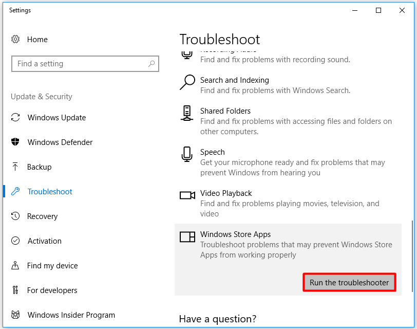 Step 3: Scroll down the right side of the Troubleshoot page to find Windows Store Apps. Click it and then select the Run as troubleshooter option. Then the program will try its best to identify and fix the file system error (-2147219196) automatically