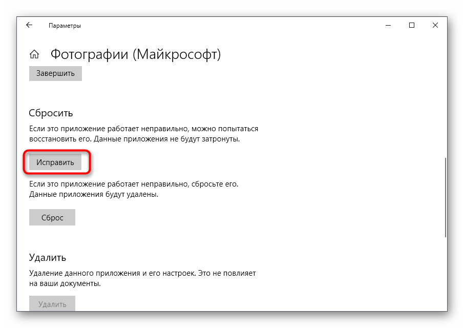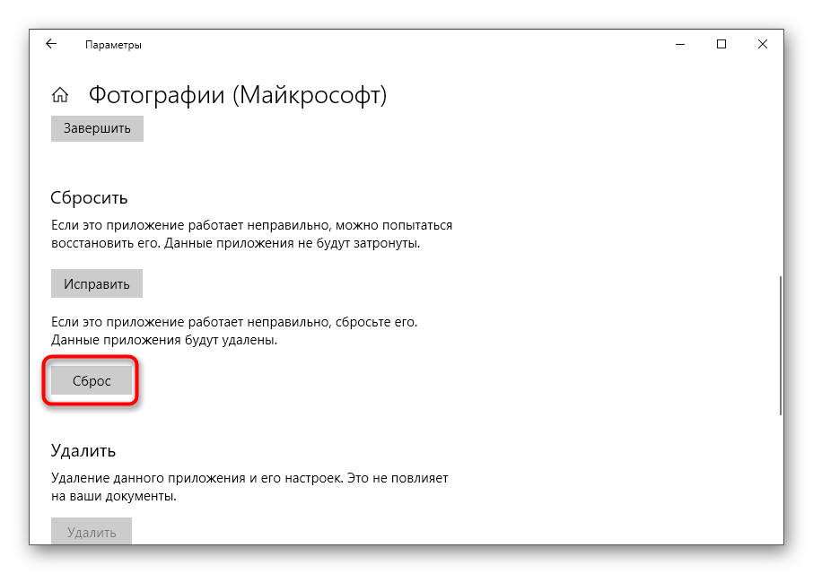 Если устранить ошибку 2147219196 описанным выше способом не удалось, сбросьте приложение, при запуске которого она возникает. Так, отмечены случаи, когда ошибка появлялась при открытии изображений во встроенном графическом просмотрщике «Фотографии».