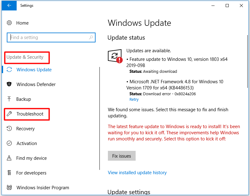 Step 2: Choose Troubleshoot in the left side of the Windows Update page.