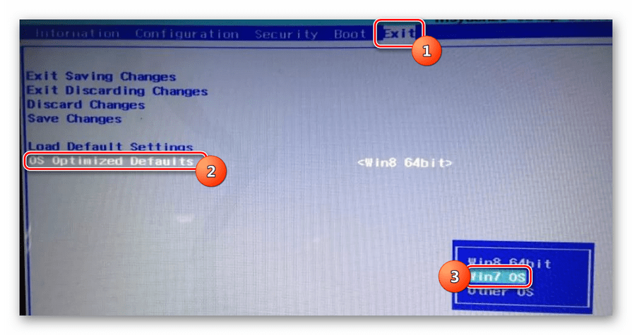 - В интерфейсе БИОС (он может отличаться в зависимости от версии, но принцип действий останется тем же) потребуется указать нужную ОС. Для чего идём на вкладку «Exit» и выбираем «OS Optimized Default», после чего жмём Enter и в дополнительном меню нажимаем Win7 OS – Enter.