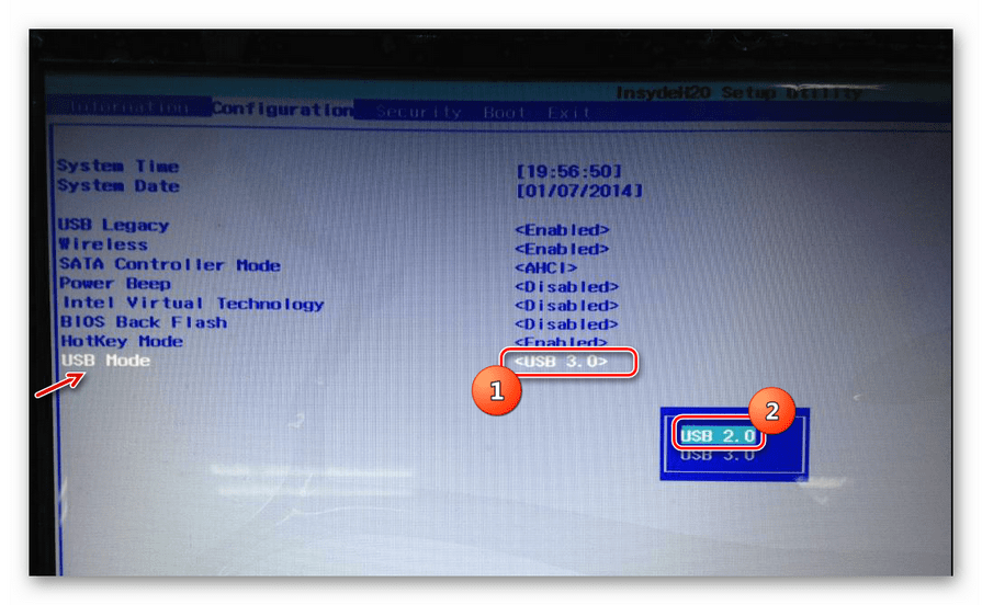 - Идём на вкладку «Configuration» и для параметра «USB Mode» вместо «USB0» выбираем «USB 2.0». После установки Windows 7 потребуется вернуться к прежним параметрам, поскольку в противном случае драйверы для USB 3.0 установлены не будут.